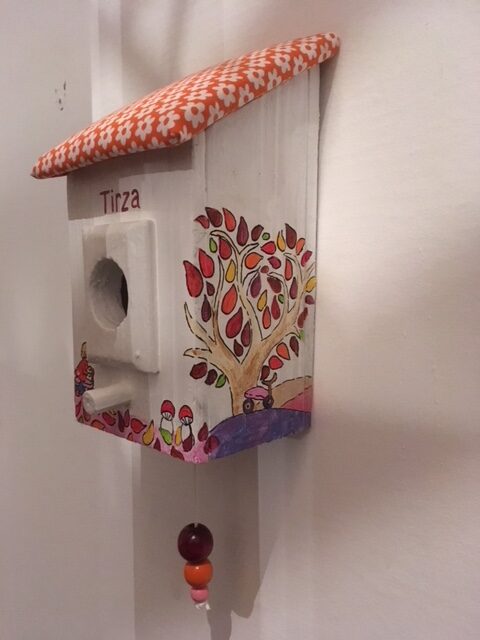 Een vogelhuisje in de stijl of kleur van de kinderkamer met naam. Leuk voor op de deur i.p.v. alleen de naam of voor aan de muur met een muziekdoosje erin zodat je kindje lekker gaat slapen. Een heel persoonlijk cadeau als hij beschilderd is aan de hand van het geboortekaartje.